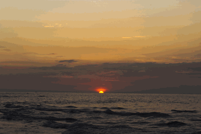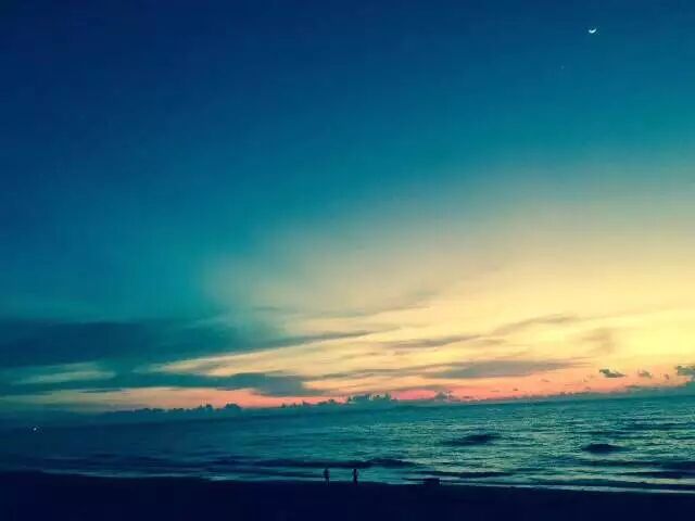 月亮湾位于海南岛最东岸,是看日出的最佳地点。出发的时候,天色未亮,草尖上还挂着晶莹的露珠,茫茫天地间,光明如期而临,太阳从海平线上缓缓升起,阳光将海天染红,洒向海面,洒向万物……