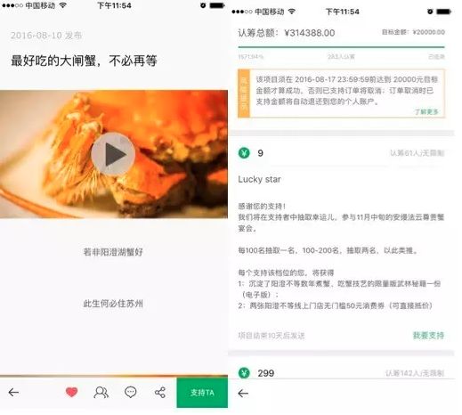 阳澄不等首先试水的是开始吧,他们在上面做了大闸蟹的第一波预售,7天时间,众筹完成度超过1500%,金额达到31万。而这一切,阳澄不等没有花1分钱在推广上。