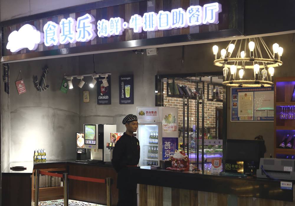 外部开放座位区的墙上,彩绘着翻滚在巨浪里的鲸鲨,气势十足。每个餐桌之间间隔很大,保证了用餐的舒适度。