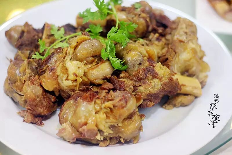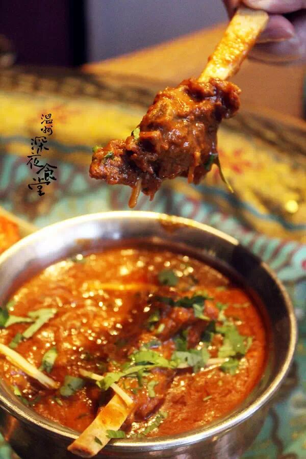 从一缸满满的咖喱酱里,拉出一块羊蝎子,浓浓的咖喱融入肉里,好吃到用舌头舔汁。