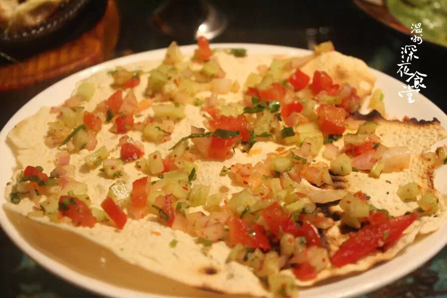 黄瓜、洋葱、西红柿、香菜切成丁,过一遍香料,洒在超脆的薄饼上,用勺子或手敲一片,带着蔬菜一起入口,咔呲咔呲,香脆爽口。