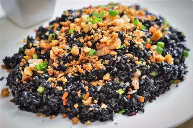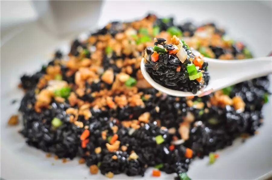 不同于一般的炒饭,这一份用了营养更加丰富的黑米。多吃点粗粮对于城市人来说是再必要不过的了。黑米略带糯性,吃起来特别有嚼劲,加了鸭肉一起翻炒,也格外的香。