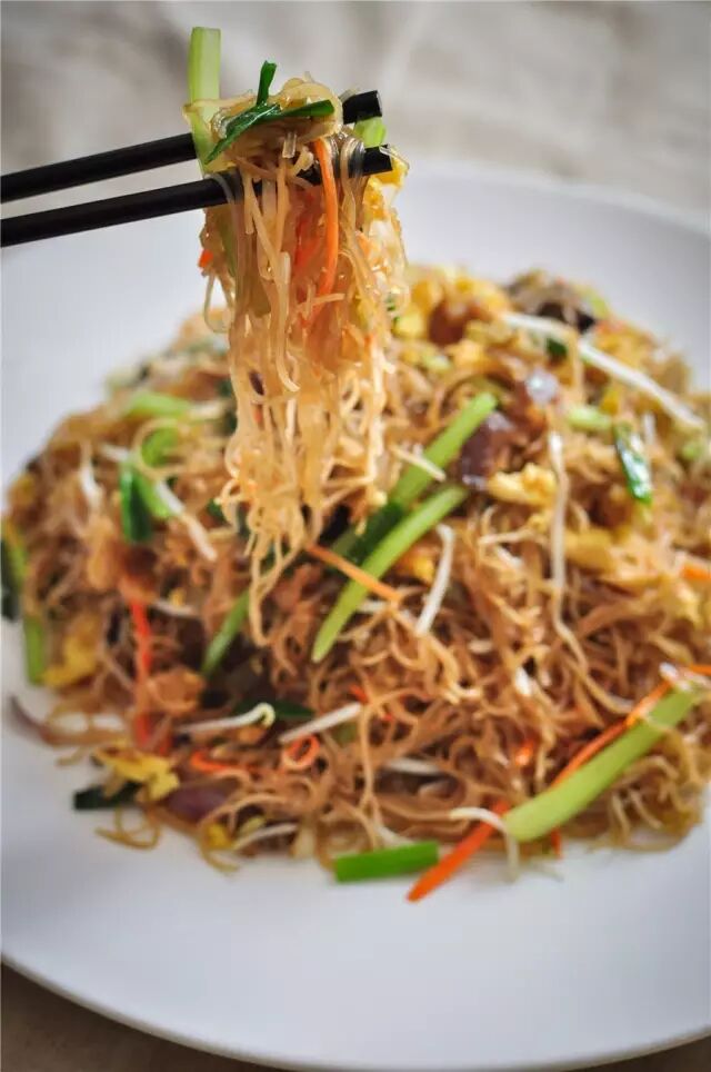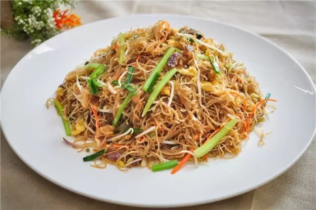 炒双粉是浙江温州传统的汉族小吃、双粉二字,即番薯粉和细粉丝。高楼炒双粉的做法颇为讲究,双粉下锅前,要先在温水中浸泡,且要分先后,番薯粉先放,粉丝稍后,浸泡过的双粉炒出来后,较一般的炒粉更具韧性。热好猪油,双粉下锅,文火翻炒十余分钟,期间要将笋干、肉丝、豆芽放进去,即可上桌。番薯粉有弹性,细粉丝相辅相成,很有口感。