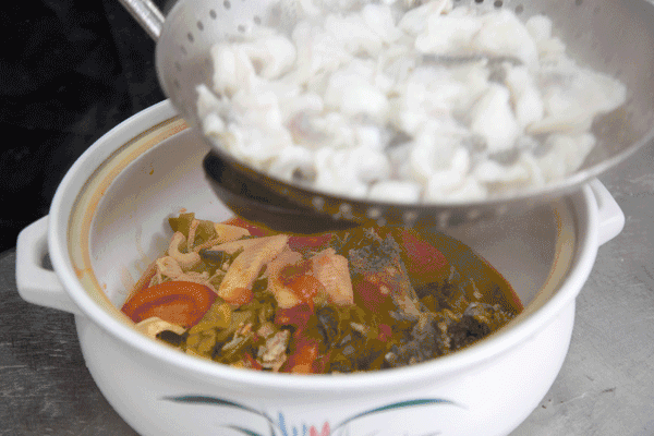 将底料置于碗底后在上层铺上鲜嫩的鱼肉