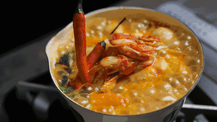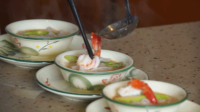 龙虾汤煮河粉中的汤头是用大只的澳洲龙虾熬制,熬制的时间不必太长,15min左右即可,这样,不仅能把虾头中虾黄虾膏的香甜熬进汤里,更能极大限度的保留了虾汤原本的清爽鲜味,既鲜又甜,美不胜收。搭配的河粉最好是手工制作,手工河粉相较更爽口绵滑,更易让汤汁渗入粉中,更加的入味,再加上新鲜的大虾和芦笋,鲜甜营养的一碗龙虾汤煮河粉一定能给你带来无比的满足。