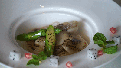 这道菜品中淮山和芦笋的色泽都非常漂亮,芦笋特别的绿,吃起来相当的脆爽,感觉非常的清香,一点软趴趴的感觉都没有。淮山还能吃到那独有的滑滑的口感。摆盘也是相当的精美。虾仁非常的大颗,而且非常新鲜,之所以那么新鲜是跟海游轩独特的食材采购渠道以及对于食材的尊重精神有关的。