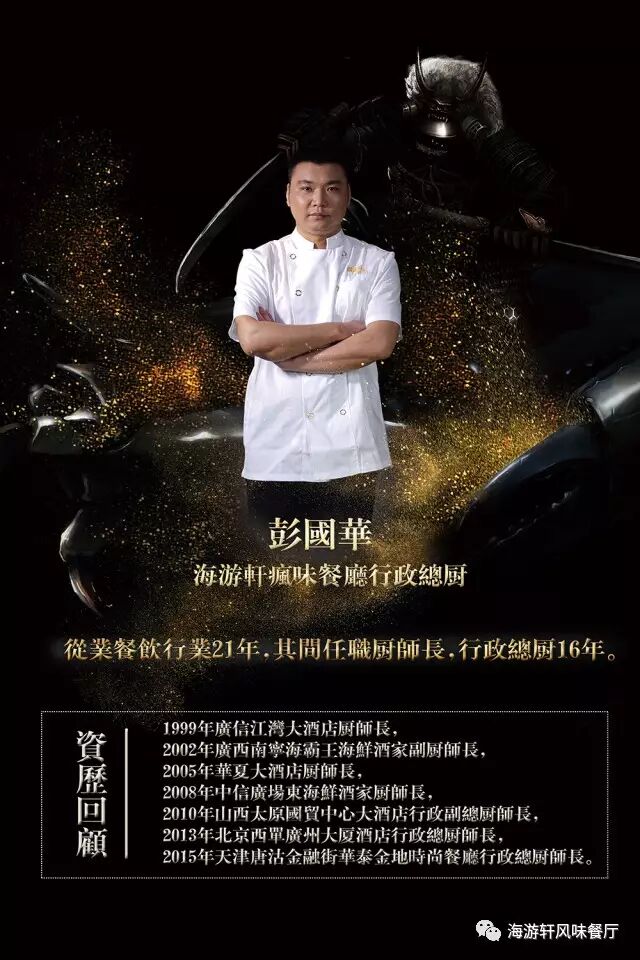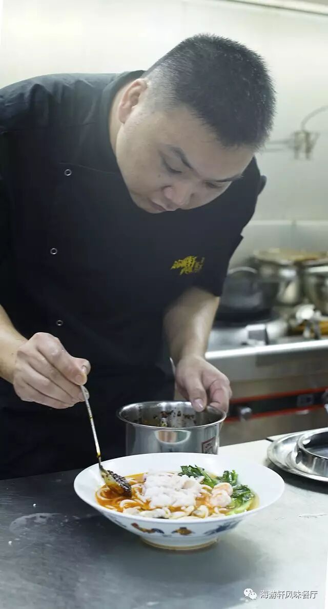 餐厅由从事餐饮行业21年,担任16年行政总厨的彭国华担任海游轩的行政主厨,更有四道米其林餐厅主厨为海游轩定制的四道米其林菜式。
