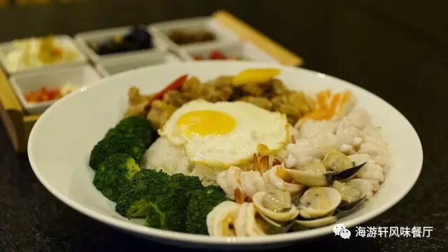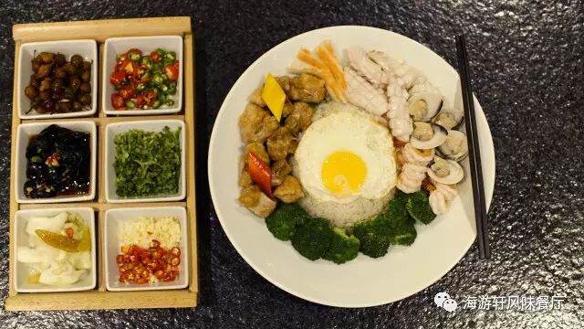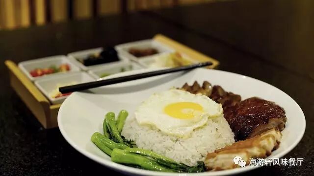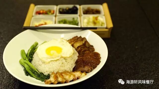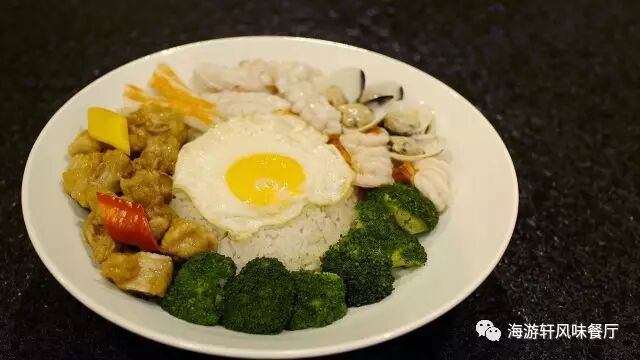 牡蛎、鱿鱼、蟹柳、大虾配上排骨,排骨以烧卤的方式制作。烧卤配上海鲜的感觉,在平常你可能需要同时点上两样菜才能尝试到烧卤配海鲜的感觉。而在海游轩您只需要一份堪称豪华午餐的《疯味海鲜排骨饭》得以口福。