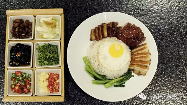 桂林卤菜粉,以粉中有多重烧卤味配菜而得名。而这一道《疯味烧卤拼盘饭》正是以三项卤味为主打而得名。