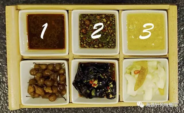 1.海南辣椒汁、2.海南鸡经典酱汁、3.蒜蓉酱汁