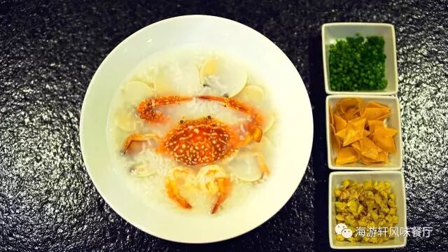 潮汕大碗海鲜粥是由蟹,对虾为主料,配上色拉油、猪油、生姜、萝卜条、葱花等制作完成的菜肴,熬粥的主料要选择上好的东北大米,口味属于咸鲜,海鲜粥中的大米具有很高营养功效。