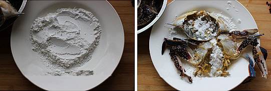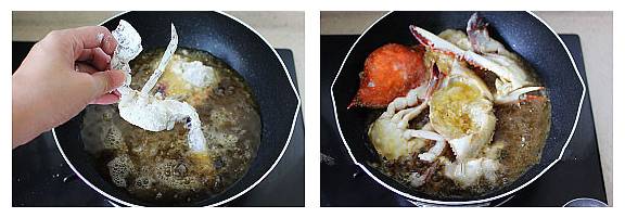 2、热锅上油,油温6.7成热时,把蟹块切口处裹上或者粘上淀粉.下锅炸至偏金黄、然后起锅沥油