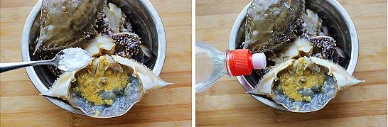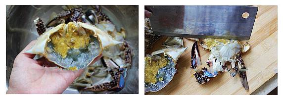 1.螃蟹刷洗干净,开盖,去蟹腮,蟹心!把蟹剁块,加盐,料酒,胡椒粉稍腌一会,最好腌制两小时