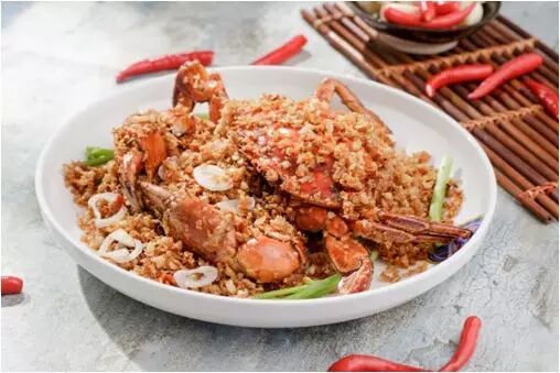 这是一道传统泰国菜其精髓是那蒜蓉的独特风味,这种蒜蓉的特别之处在于它的甘口焦香,脆而不煳,蒜香味与辣味结合,达到了一种口味的平衡。与螃蟹共烹,味道和谐,可口极致。