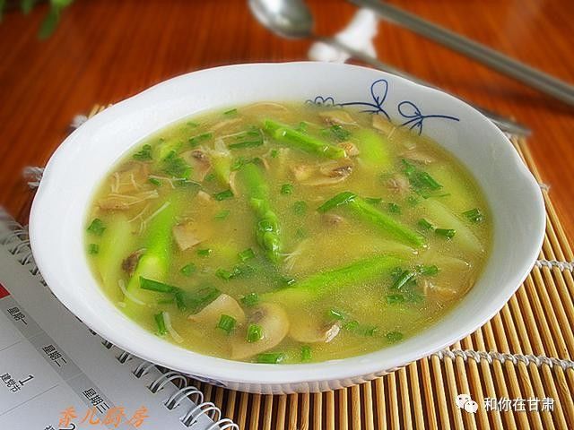 【食材】芦笋 6根 / 小平菇 几朵 /干贝 一小把 /胡萝卜两片 / 白果 几颗/ 食盐 少许/