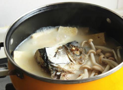 5.炖了一会的鱼汤已经变成乳白色,加入煎好的豆腐和洗净的海鲜菇,加适量盐和五香粉,继续盖盖炖40分钟