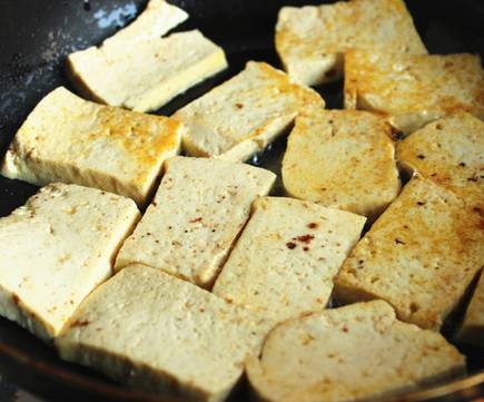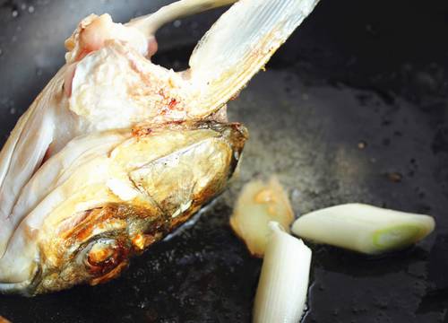 5.锅热后倒入油,待油7成热时候,放入鱼头放入,改成中小火,将鱼头两面煎成金黄色后,盛出备用