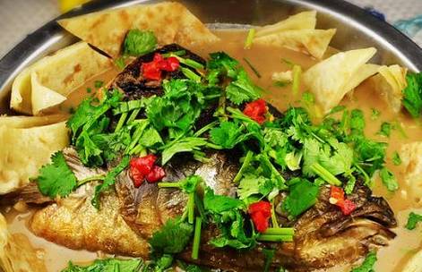 9.将炖好的鱼头和汤汁一起倒入铺有白菜叶的锅中,吃的时候,把切成小块儿的烙饼放入汤里即可
