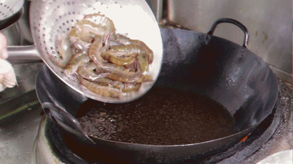 虾剪头开背立马要先在油锅里滚6秒,