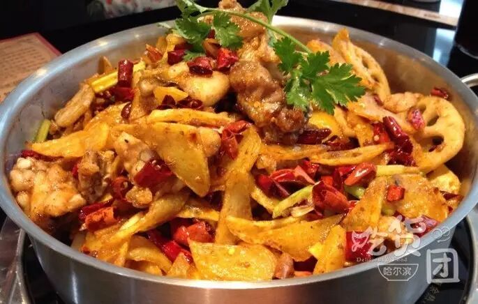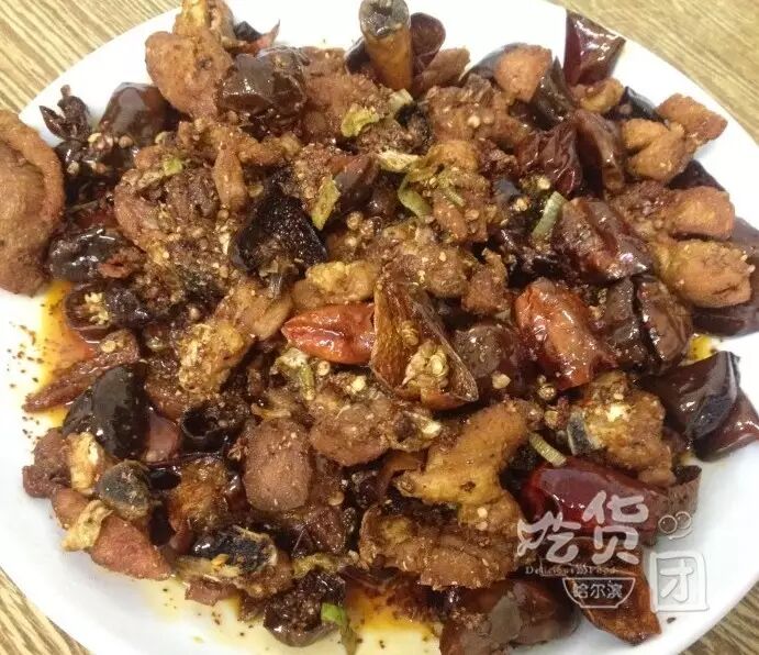 辣子鸡满满的辣椒和鸡块 有点干 有料在上面会有点咸 但看上去也是超爽