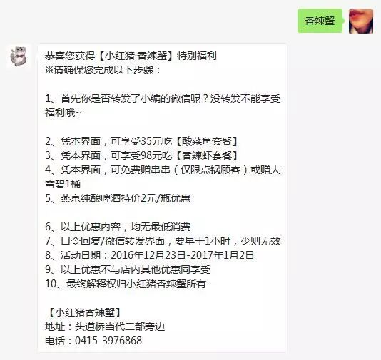 2、凭指定口令回复界面,可享受98元吃【香辣虾套餐】,套餐原价154元