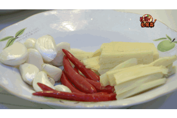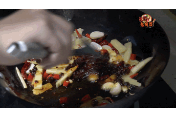 6.切干辣椒、姜片、蒜粒,倒入另起的油锅翻炒。