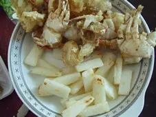4.焯水的螃蟹控干水分,用盐,胡椒,淀粉腌渍十分钟。油锅炸金黄捞出,山药也炸金黄。