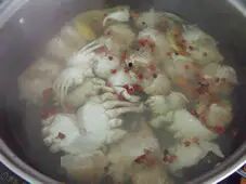 1.原料,螃蟹去收拾干净,去腮,剪脚分块。