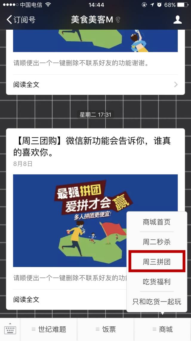 点击菜单栏【商城】-【周三拼团】,进入拼团页面。