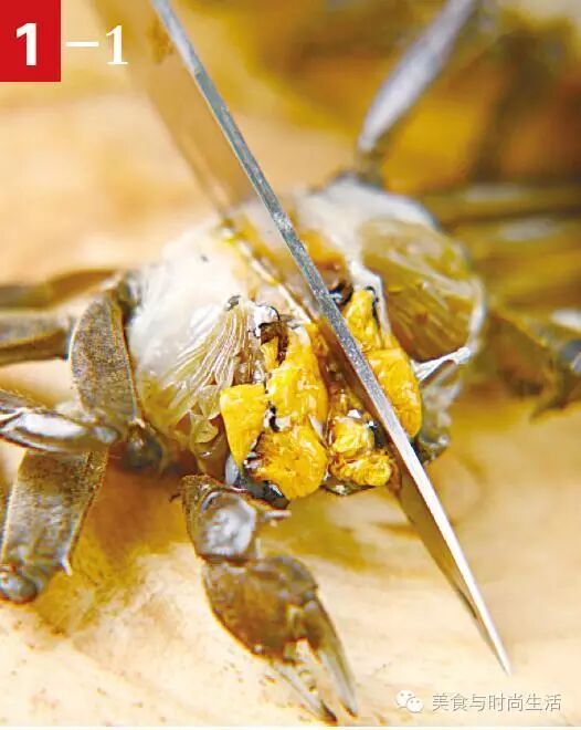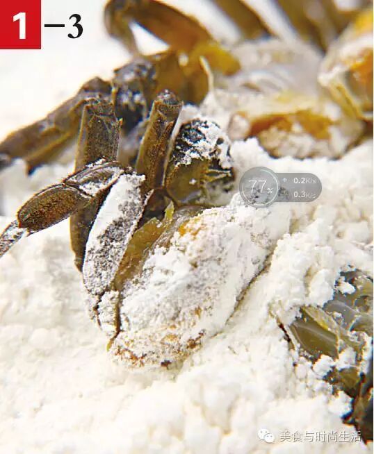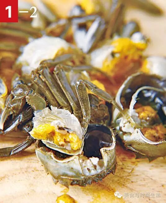 油锅用旺火烧至六成热,下入蟹块,待炸至金黄色时倒入漏勺,沥油。