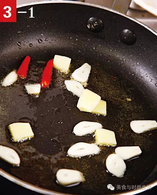 油锅用旺火烧热,下入姜片、蒜片、泡红椒、尖红椒炒香
