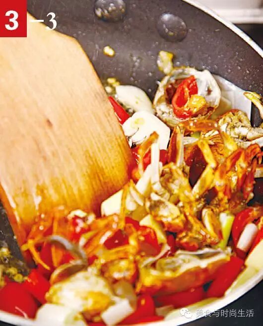 再加入蟹块、辣酱、盐、味精、白糖拌炒均匀