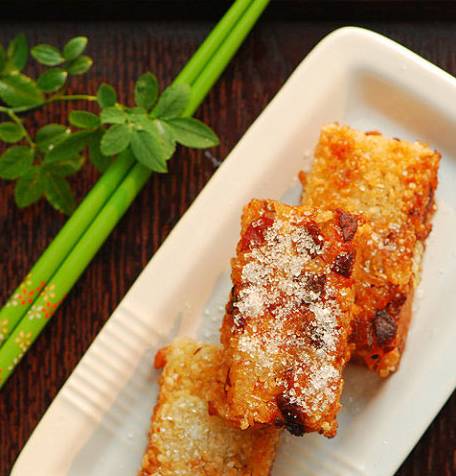 6、锅中热油,三成热时,中火,放入糍粑坯,炸至外表金黄取出控油