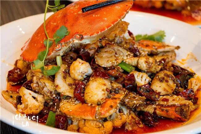 用肉蟹辅以葱、姜、花椒、花椰菜、干辣椒等爆炒,