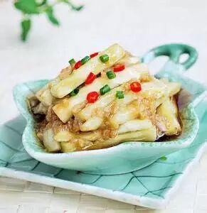 5、将蒜蓉和麻酱浇到蒸好的茄子上,拌匀即可。