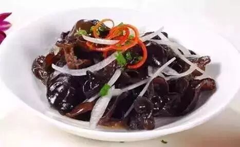 3)汤锅中水开后,下黑木耳焯至水再开即可捞出,过凉水后备用。根据个人喜好可将胡萝卜也焯一下;