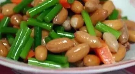 花生米捞出来,趁热,拌上盐,糖,味精,香油,拌进去蒜薹与胡萝卜,就OK了。煮花生的时候,不要放盐,如果放了,就变成黑色的了。