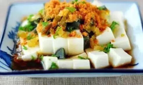 3、将皮蛋丁、榨菜碎放在豆腐上。