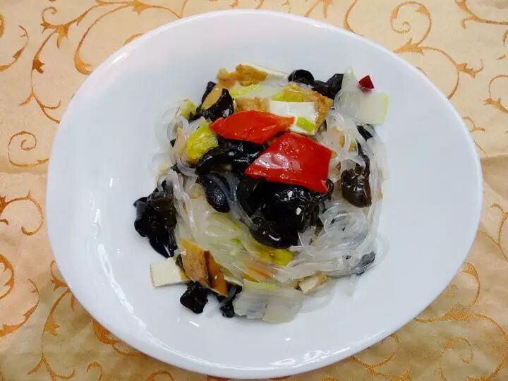 找不到合适的名字,就叫素4样,有粉丝,圆白菜,油豆腐和木耳。蒜切片,姜切末,放锅里炒香,下油豆腐煎一下,然后放木耳和圆白菜炒一炒,圆白菜发软了,淋点料酒,放点盐,五香粉,白糖少许,鸡精也放点,最后把水发粉丝放进去,找几下就行了,粉丝吸水,如果用铁锅炒的话会粘锅,所以要放些水进去,用不粘锅的话就直接炒就行了,最后淋点香油。