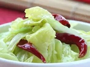 2)锅烧热后倒入油,待油5成热时放入干红辣椒和蒜末,煸出香味后倒入圆白菜片儿,淋入料酒,米醋,调入白糖和盐,翻炒均匀后即可。