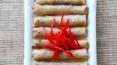 5、一片萝卜摊于案板,舀一勺肉馅,卷起,同样做法卷好所有的萝卜卷;