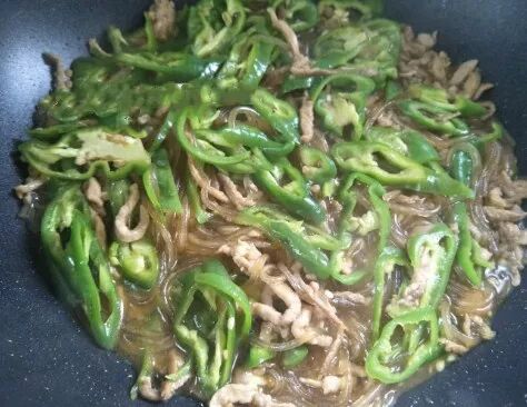螺丝椒3根、猪廋肉1块、蒜苗2根、红薯粉条小把,生抽少许,酱油少许,盐适量,淀粉一小勺,料酒少许