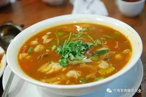 杂烩汤,以牛肉、粉条、豆腐、丸子、菠菜……等原料制作而成,味道比较“汆”,以酸、辣为主,极合我们新疆人的口味。