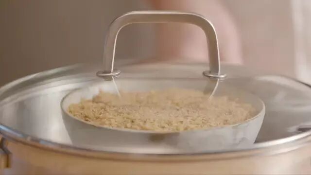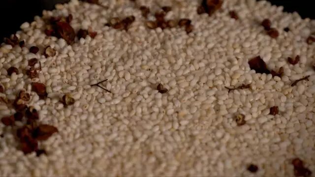 架一口平底锅,开小火,放一把米不断翻炒,再加几粒掰碎的八角,以及小把花椒,一起翻炒;