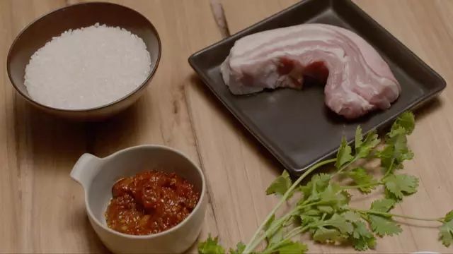五花肉250克,大米150克,南瓜100克,豆瓣酱两大勺,花椒1小把,八角2-3颗,料酒50毫升,酱油20毫升,香菜少许,水1杯。