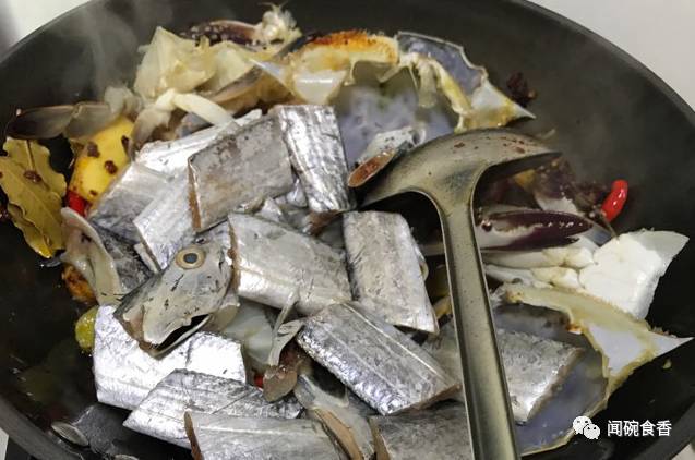 带鱼也倒入翻炒一下、带鱼可以裹上淀粉炸一下、待香辣蟹快起锅时倒入、也可以这样直接烧