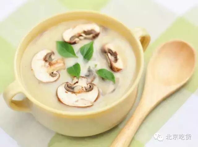 蘑菇、洋葱、黄油、面粉、干白、淡奶油、牛奶、烤面包丁。