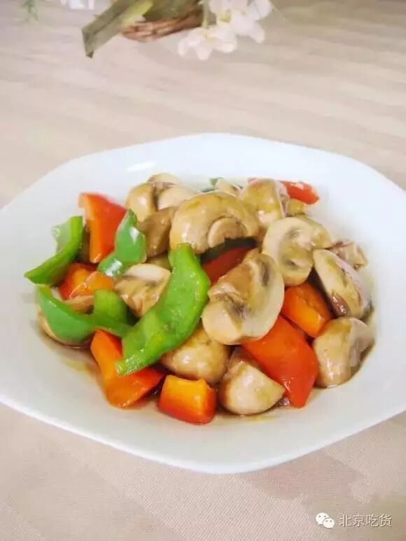 1、蘑菇、青椒洗净,蘑菇切成片,青椒切成菱形片。