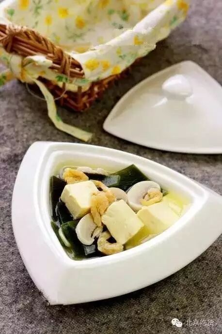 蘑菇、海带、豆腐、虾皮、葱、胡椒粉。