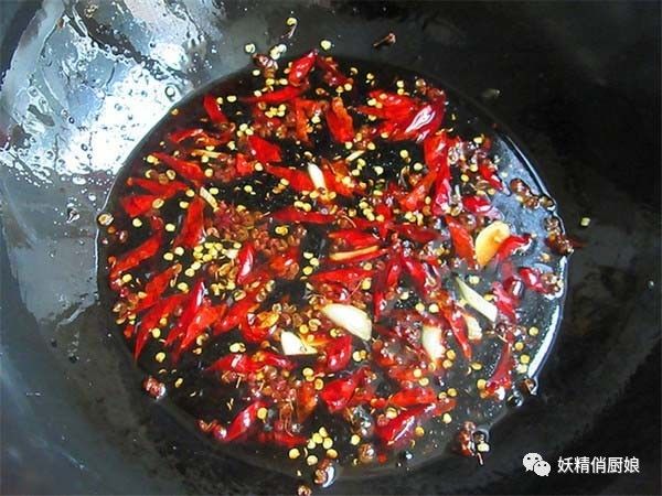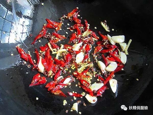 2.锅烧热注入油,七分热时倒入葱姜蒜辣椒花椒炝出香味。